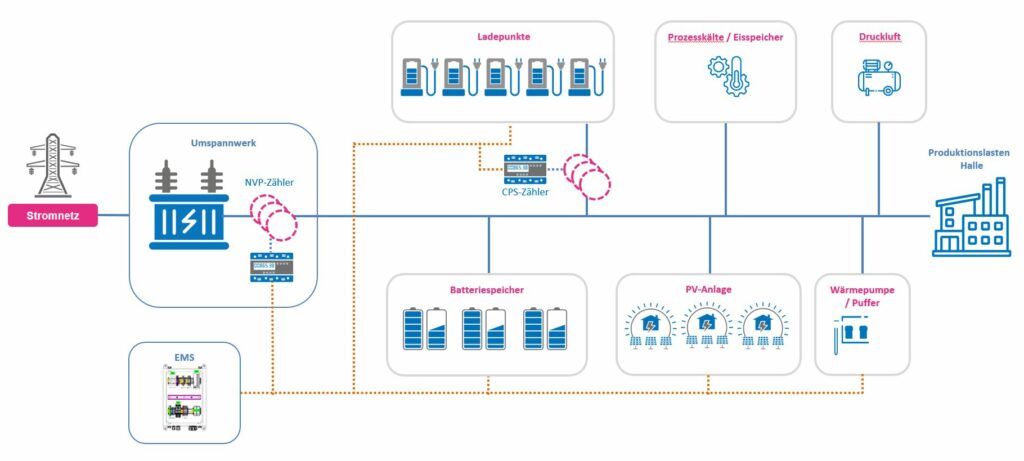 - Kälte, Druckluft und Fuhrpark flexibel einbinden, Strom nutzen, wenn er verfügbar oder günstig ist